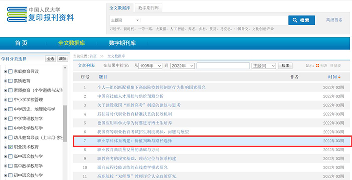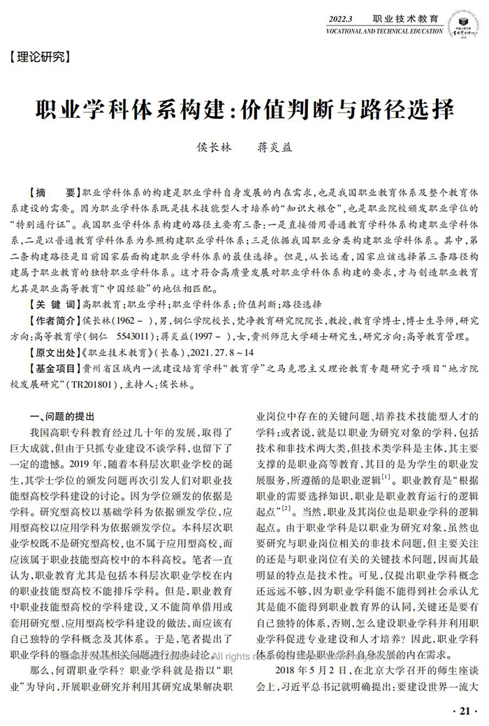 近期,beat365官网校长、二级教授、教育学博士侯长林与其所带硕士研究生蒋炎益合作的论文《职业学科体系构建:价值判断与路径选择》被中国人民大学复印报刊资料《职业技术教育》2022年第3期(21-29页)全文转载。该论文有12000余字,原发表于中文核心期刊《职业技术教育》2021年第27期,系贵州省区域一流建设培育学科(教育学)项目(201785)阶段性成果。