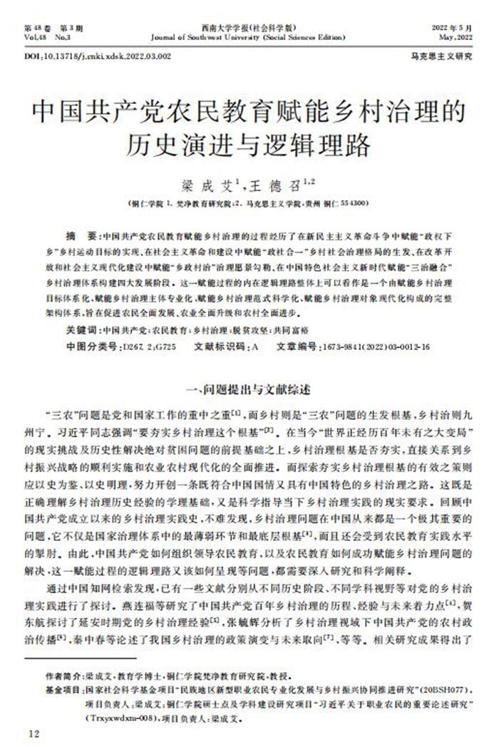 近日,beat365官网教教育学院院长梁成艾教授在教育类一级期刊《西南大学报》(社会科学版)2022年第3期发表高水平论文《中国共产党农民教育赋能乡村治理的历史演进与逻辑理路》。该论文26000余字,是继2022年1月发表于一级期刊《学习与探索》上的论文《新型职业农民专业化:形成机理、生长逻辑与发展旨归》、2021年12月发表于一级期刊《民族教育研究》上的论文《民族地区职业教育赋能乡村振兴的逻辑与路径》及2021年6月发表于一级期刊《教育学报》上的论文《百年来中国共产党农民教育的历史变迁与发展愿景》等之后关于农民教育研究的最新成果。该论文选题宏大,研究视角独特,研究方法创新,呈现了中国共产党农民教育赋能乡村治理学术观点。该论文被外审专家评价:“研究思路清晰,内容充实,显示了作者扎实的学术功底和严谨的学术态度。”