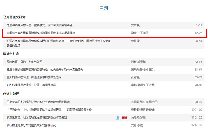 论文由“问题提出与文献综述”“中国共产党农民教育赋能乡村治理的历史演进”“农民教育赋能乡村治理的逻辑理路”三部分组成。文章指出,中国共产党农民教育赋能乡村治理的过程经历了在新民主主义革命斗争中赋能“政权下乡”乡村运动目标的实现、在社会主义革命和建设中赋能“政社合一”乡村社会治理格局的生发、在改革开放和社会主义现代化建设中赋能“乡政村治”治理愿景勾勒、在中国特色社会主义新时代赋能“三治融合”乡村治理体系构建四大发展阶段。这一赋能过程的内在逻辑理路整体上可以看作是一个由赋能乡村治理目标体系化、赋能乡村治理主体专业化、赋能乡村治理范式科学化、赋能乡村治理对象现代化构成的完整架构体系,旨在促进农民全面发展、农业全面升级和农村全面进步。为用好中国共产党农民教育高质量赋能乡村治理的基因资源、赓续中国共产党农民教育高质量赋能乡村治理的红色血脉,创立有中国共产党农民教育高质量赋能乡村治理之风格的建树,形成有中国共产党农民教育高质量赋能乡村治理之气派的影响,激荡起全党开创农民教育高质量赋能乡村治理美好未来的奋进力量,深入贯彻落实党的十九大和十九届历次全会精神,围绕习近平总书记系列重要讲话和《中共中央关于党的百年奋斗重大成就和历史经验的决议》,加强党对农民教育的全面领导,始终坚持用马克思主义的立场、方法与具体的时代背景和实践要求相结合之原则来分析这一赋能过程中存在的问题和困难,以农业供给侧结构性改革和农民需求侧平衡性变革为突破口,“坚持把立德树人作为根本任务”之必然要求与农业农村现代化的现实需要相结合,激活农业农村发展新动能,谋划“百姓富、生态美、文化兴、产业旺”的乡村振兴建设蓝图,接续全面推进乡村振兴,确保农业稳产增产、农民稳步增收、农村稳定安宁,推动农业农村现代化迈出新步伐。