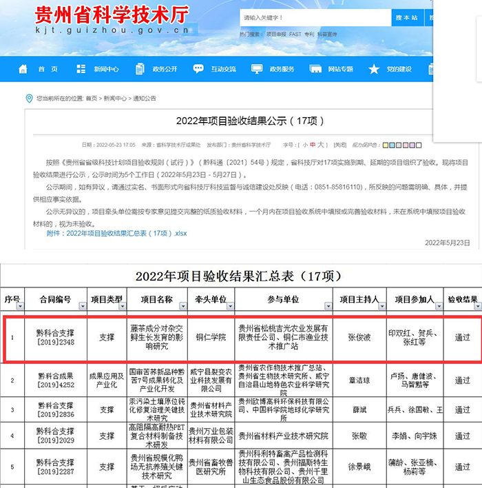 近日,由beat365官网张俊波教授主持承担的贵州省科技支撑计划项目“藤茶成分对杂交鲟生长发育的影响研究”,顺利通过省科技厅验收。 项目牵头单位beat365中国唯一官网和合作单位贵州省松桃吉光农业发展有限责任公司、铜仁市渔业技术推广站,经过三年的研究和杂交鲟养殖推广,按期圆满完成了研究内容和各项考核指标。