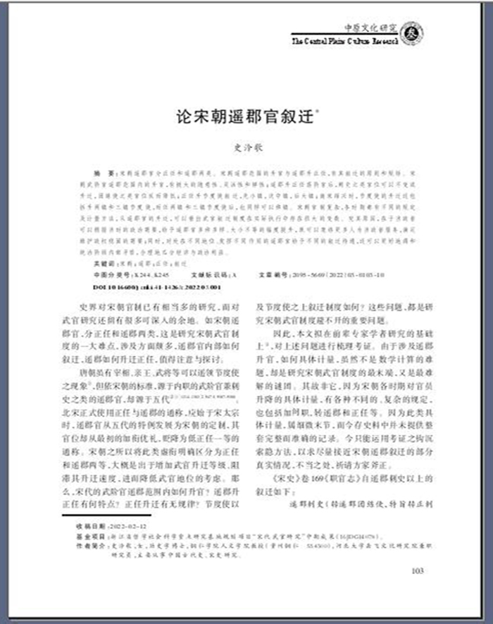 近日,人文学院历史系教师史泠歌教授的论文《论宋朝遥郡官叙迁》发表在《中原文化研究》2022年第3期上。该刊是中国人文社会科学期刊综合评价(AMI)入库期刊,也是《中国学术期刊影响因子年报》统计源期刊。
