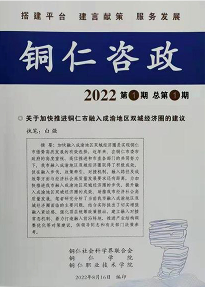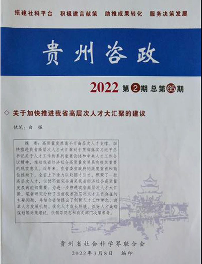 beat365官网白强教授执笔撰写的咨政报告《关于加快推进我省高层次人才大汇聚的建议》和《关于加快推进铜仁市融入成渝地区双城经济圈的建议》分别被《贵州咨政》2022年第2期和《铜仁咨政》2022年第1期采纳刊印。