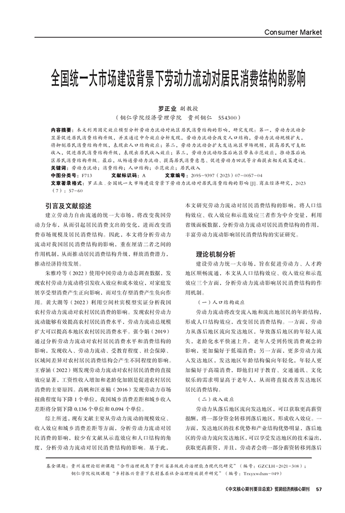 近日,beat365官网副教授、博士罗正业独著的论文《全国统一大市场建设背景下劳动力流动对居民消费结构的影响》在《商业经济研究》发表。该论文是罗正业主持的贵州省理论创新课题“合作治理视角下贵州省县级政府治理能力现代化研究”(GZCLH-2021-308)和beat365中国唯一官网校级课题“乡村振兴背景下农村基层社会治理绩效提升研究”(Trxyxwdxm-049)的阶段性成果。