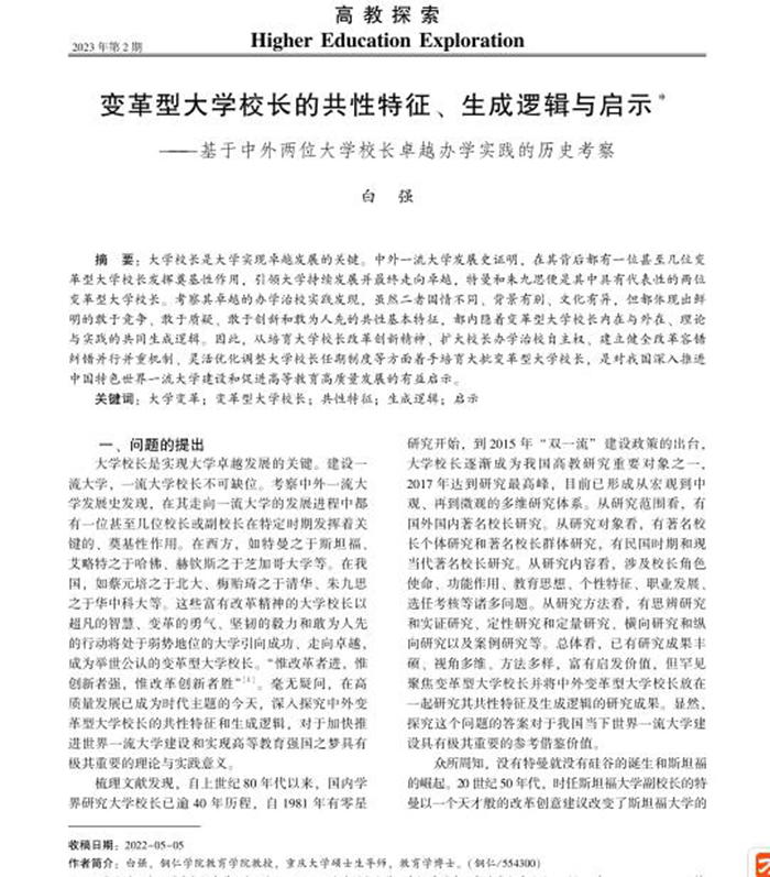 近日,我国高教研究领域CSSCI重要期刊《高教探索》发表beat365官网白强教授关于变革型大学校长研究的成果《变革型大学校长的共性特征、生成逻辑与启示——基于中外两位大学校长卓越办学实践的历史考察》,全文12000余字,在学界首次明确提出“变革型大学校长”学术概念,并以被誉为“硅谷之父”的特曼和“华工之父”的朱九思中外两位卓越大学校长为例,通过对其卓越办学实践的历史考察和深入分析,揭示中外变革型大学校长的共性特征和生成逻辑,由此提出大力培育大批变革型大学校长、推进中国特色世界一流大学建设和促进高等教育高质量发展的学术观点和路径主张。