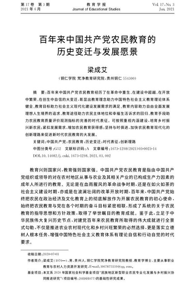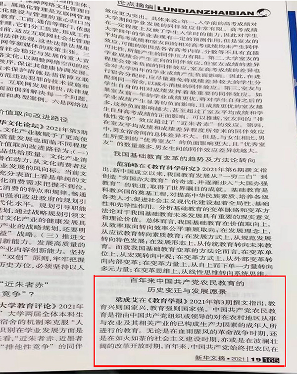 近日,我校教育学院院长、三级教授梁成艾博士独著的论文《百年来中国共产党农民教育的历史变迁与发展愿景》发表于全国中文核心期刊《教育学报》2021年第3期,随即被《新华文摘》论点摘编(2021年19期)。该论文有13000余字,研究内容具有创新性,研究领域具有开拓性,凸显了我校哲学社会科学的原创能力和社会影响力。