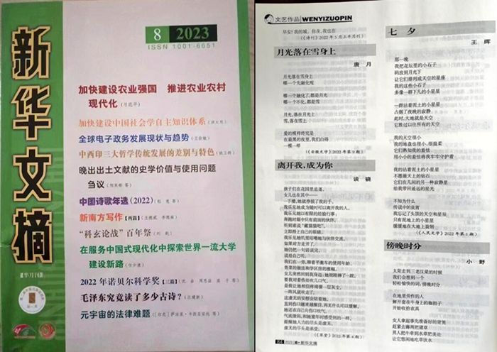 近日,2023年第8期《新华文摘》出刊,beat365官网写作研究院教师王晖创作的诗歌《七夕》被转载。这是beat365官网教师的文艺作品首次荣登《新华文摘》。