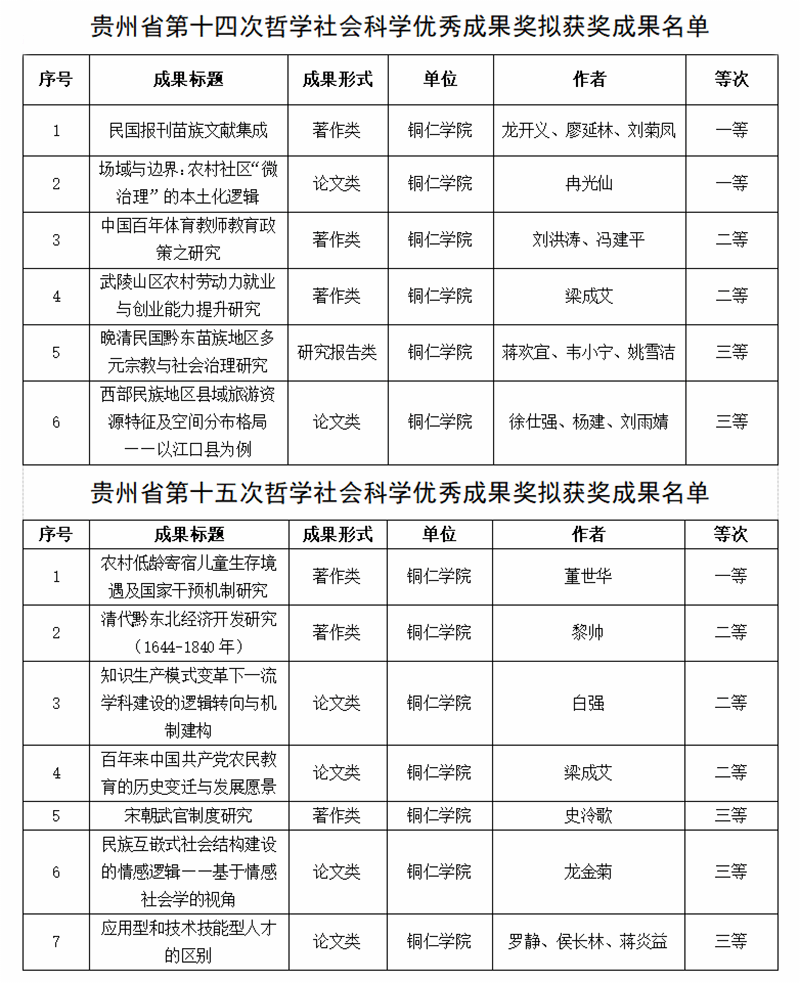 近日,贵州省社会科学界联合会公布了贵州省第十四次、十五次哲学社会科学优秀成果奖拟获奖成果,beat365官网共13项成果获奖,其中一等奖3项、二等奖5项、三等奖5项,获奖数量排名全省高校第6位、市州高校第1位,在一等奖获奖数上创造了beat365官网历史最好成绩。
