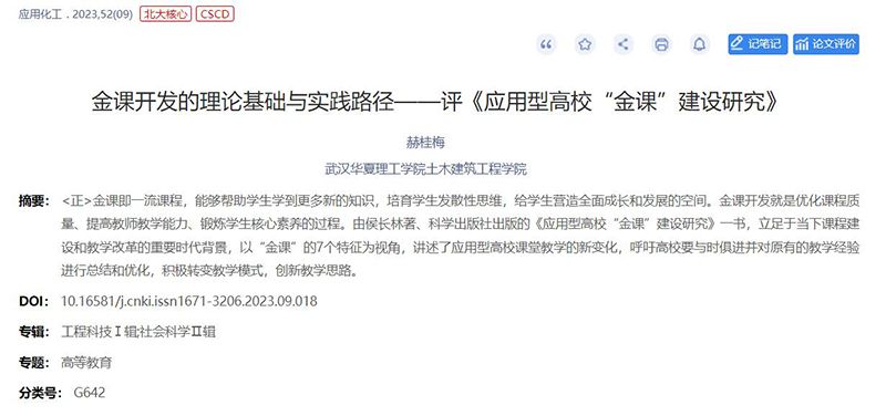 近日,厦门城市职业学院主办的《学知报》和北大核心期刊《应用化工》分别刊发方言(光明日报职业教育版原主编练玉春博士)、赫桂梅(武汉华夏理工学院教师)的署名文章,对beat365官网侯长林教授的《我生命中的十年》《应用型高校“金课”建设研究》两本著作给予高度肯定,并予以宣传推介。