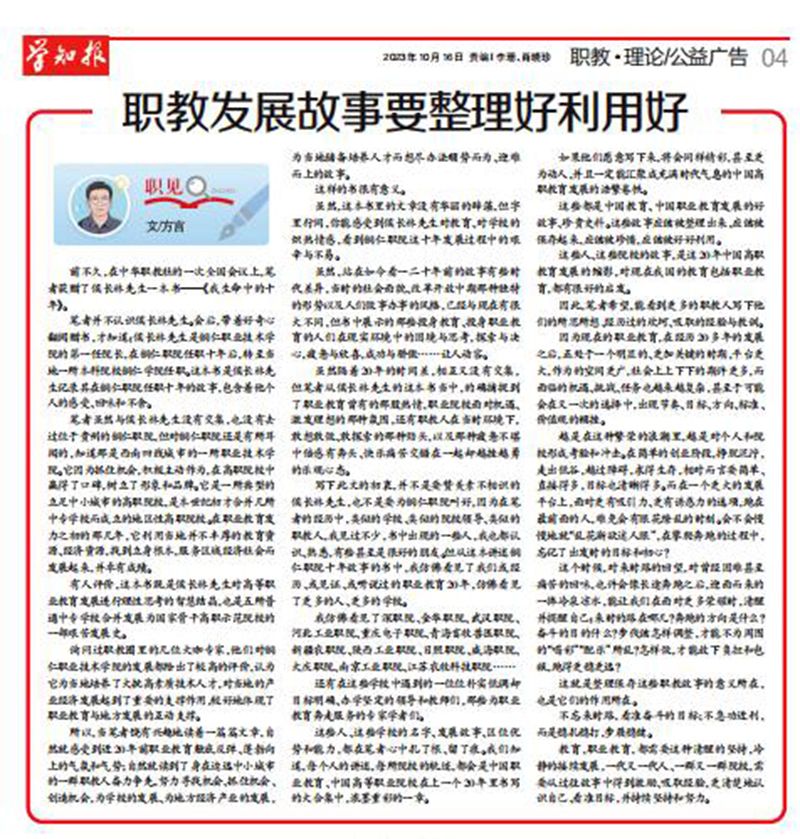 方言在其《职教发展故事要整理好利用好》一文中认为,《我生命中的十年》一书是侯长林教授对高等职业教育发展进行理性思考的智慧结晶。通过阅读这本书,作者深切感受到了中国高等职业教育20年来的发展历程,并强调高等职业教育领域所涉及的珍贵史料和优秀故事应该被珍惜和充分利用。文章指出,侯长林教授在职业教育领域的研究和实践,不仅推动了铜仁职业技术学院的发展,也为全国职业教育作出了重要贡献。文章呼吁更多的职业教育从业者将自己的思考、经历中的坎坷、吸取的经验与教训写下来,共同推动中国职业教育的发展进步。