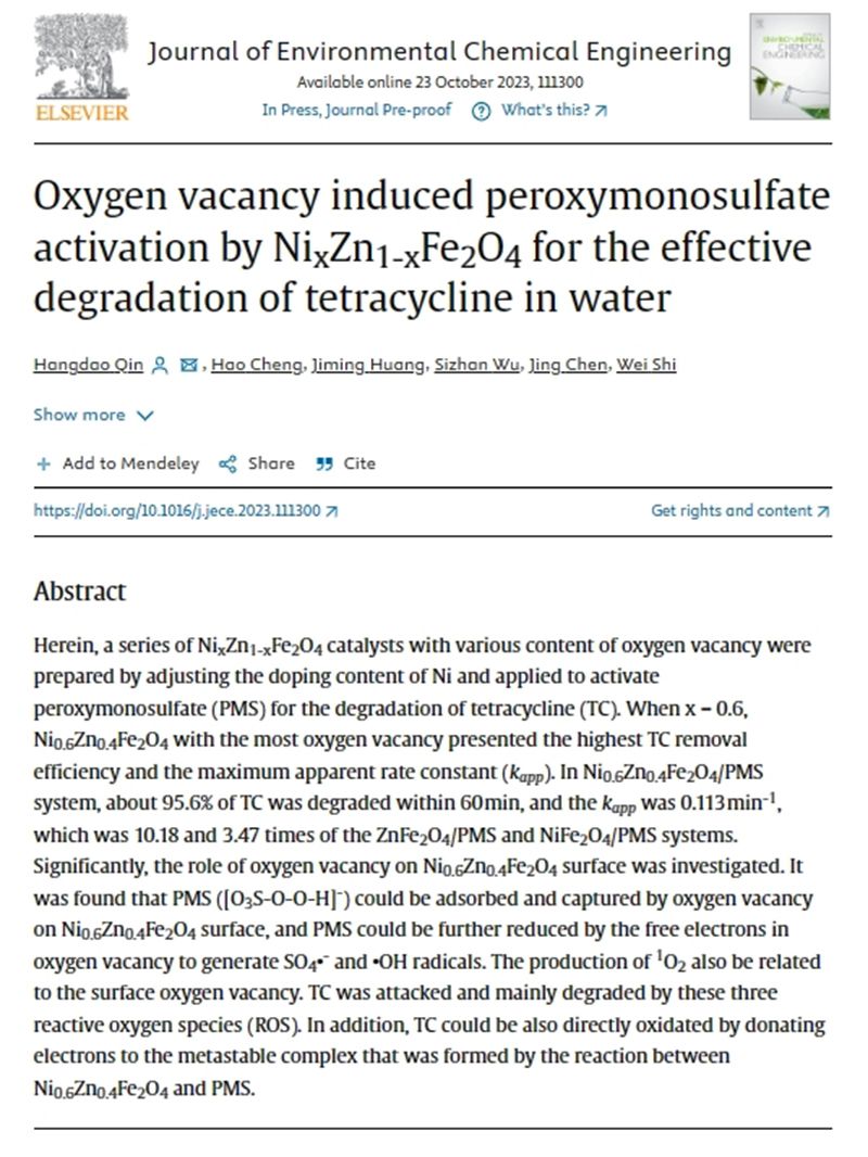 近日,beat365官网材料与化学工程学院秦航道博士(第一作者兼通讯作者)的论文“Oxygen vacancy induced peroxymonosulfate activation by NixZn1-xFe2O4 for the effective degradation of tetracycline in water”发表于SCI期刊《Journal of Environmental Chemical Engineering》。