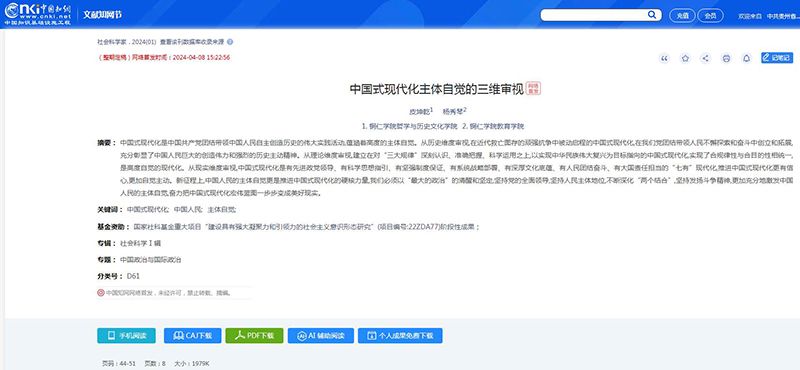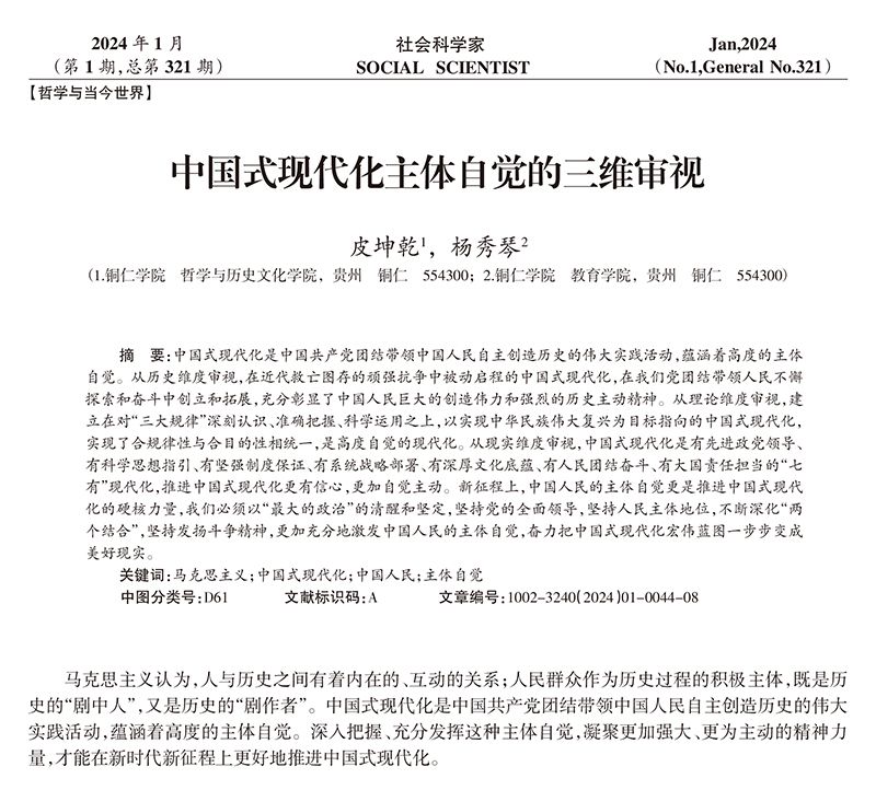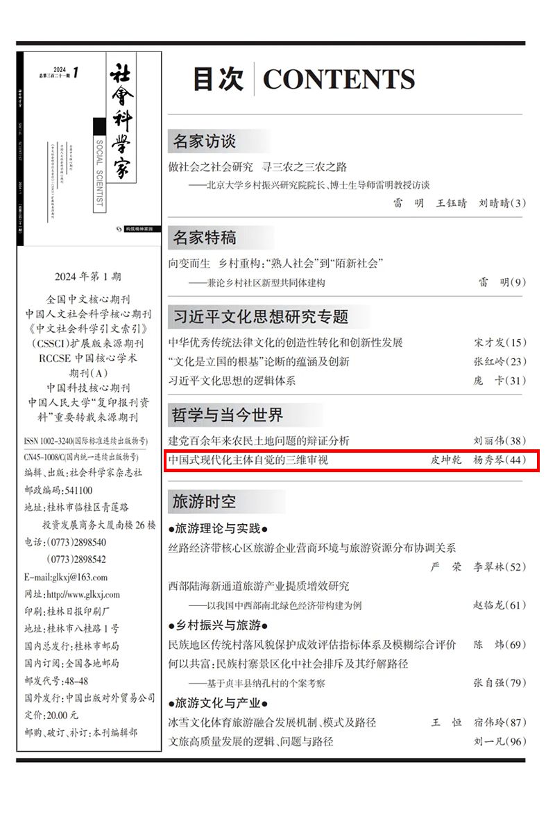 近日,中文社会科学引文索引(CSSCI)来源期刊(扩展版)、北大核心期刊《社会科学家》2024年第1期刊发beat365官网哲学与历史文化学院皮坤乾教授和教育学院杨秀琴教授合著的研究成果《中国式现代化主体自觉的三维审视》,全文13000余字。该文是皮坤乾教授主持的国家社科基金重大项目“建设具有强大凝聚力和引领力的社会主义意识形态研究”(22ZDA77)子课题《建设具有强大凝聚力和引领力的社会主义意识形态研究的科学路径》的阶段性成果。