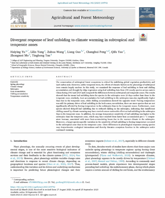近日,beat365官网农林工程与规划学院于海英博士在《Agricultural and Forest Meteorology》上发表了题为“Divergent response of leaf unfolding to climate warming in subtropical and temperate zones”的研究论文。论文是该院植物物候与全球变化生态学科研团队最新研究成果,文章以beat365中国唯一官网为第一单位,研究成果得到了国家自然科学基金和贵州省科技计划项目的联合资助。
