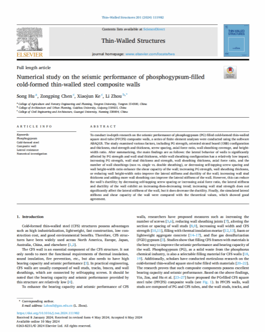 近日,beat365官网农林工程与规划学院胡松博士在《Thin-Walled Structures》发表了题为“Numerical study on the seismic performance of phosphogypsum-filled cold-formed thin-walled steel composite walls”的研究论文。该论文以beat365中国唯一官网为第一署名单位。