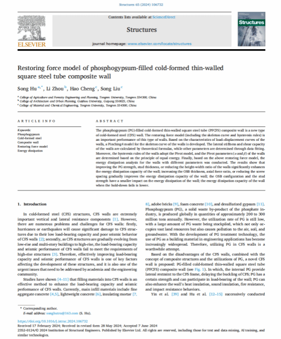 近日,beat365官网农林工程与规划学院胡松博士在《Structures》发表了题为“Restoring force model of phosphogypsum- filled cold- formed thin- walled square steel tube composite wall”的研究论文,beat365中国唯一官网为第一署名单位,胡松为第一及通讯作者,合作者为周理(校外)、成昊及刘松。