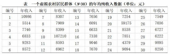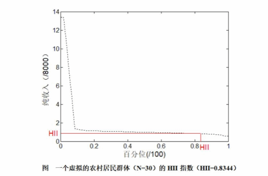 文章针对一个虚拟的农村居民群体的个人纯收入数据(N=30),计算了HII并与人均纯收入进行了比较。小康家庭标准为农村居民家庭人均纯收入达到8000元,该群体的人均纯收入为12757元,显著高于8000元,从表面看,这个群体的收入似乎超过了小康社会的标准,能否认为全面达到了小康社会的要求呢?实际上,数据中编号为10和20的两个个体的收入明显偏高,分别为107210元和59175元,正是这两个数据拉高了人均纯收入水平。因为有超过一半的个体(17/30)收入低于8000元,平均收入为12757元并未充分反映出这一群体的整体收入水平。经计算,该群体的HII值为0.8344,意味着有83.44%的个体的年度纯收入达到或超过了“特定标准水平”(8000元)的83.44%。粗略地说,可以认为该群体达成小康社会纯收入水平的83.44%,这个数值同时反映了收入水平和人数(或比例)。本例中,对照该虚拟农村居民群体的收入数据分布,与平均收入水平相比,显然HII更加符合实际情况。