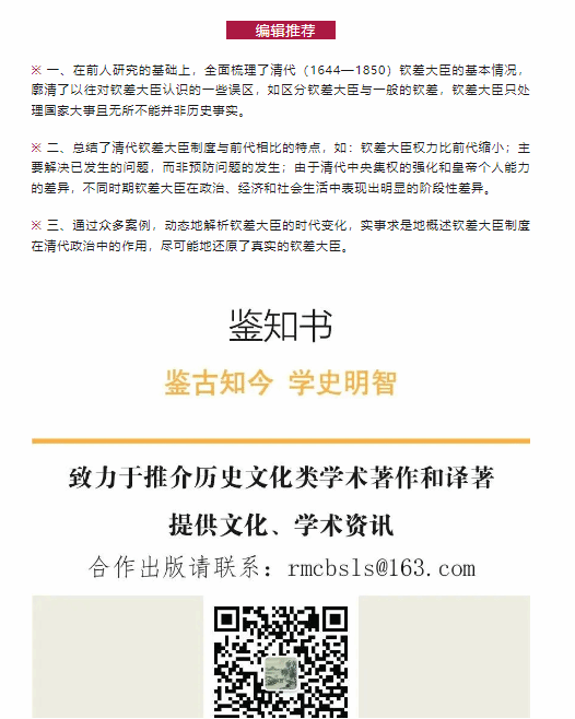 钦差大臣制度是清代政治中的一项重要制度,处理国家治理中出现的各种问题,在中国古代长期存在。《钦差大臣与清代政治(1644—1850)》分绪论、结语和六章正文,有321页,共302千字。该书以多样的史料,在前人研究的基础上,全面论述清代钦差大臣的源流、人员构成、产生原因、权力、管理规定、时代演变和在政治中的作用等内容,案例丰富,揭示了与以往不同的钦差大臣的面貌,结论扎实可信。