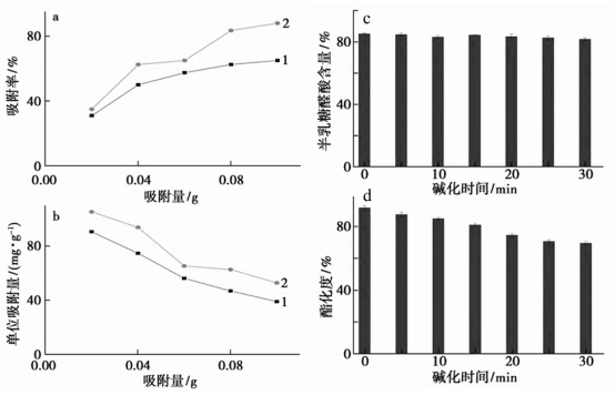 (a)Dosage均为新型吸附材料的剂量与吸附率的关系;(b)剂量与单位吸附量的关系;(c)碱化作用时间与半乳糖醛酸含量的关系;(d)碱化作用时间与酯化度的关系