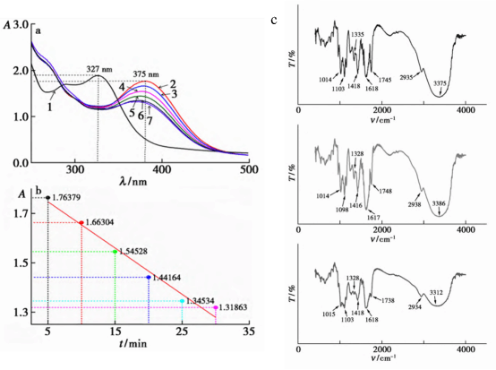 (a)果胶碱化作用的UV-Vis光谱图;(b)果胶碱化作用不同时间375 nm处的吸光值;(c)果胶碱化作用的IR光谱图
