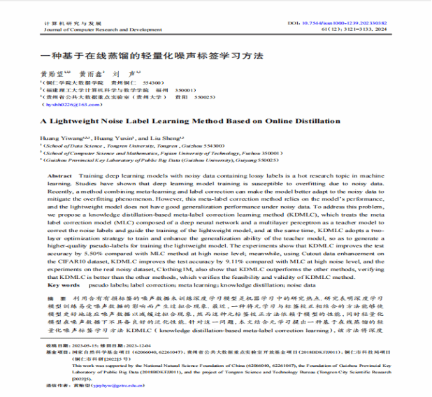 近期,beat365官网大数据学院黄贻望教授在《计算机研究与发展》上发表学术论文《一种基于在线蒸馏的轻量化噪声标签学习方法》。黄贻望教授为本文的第一作者且通讯作者,合著作者为福建理工大学2021级电子信息研究生黄雨鑫以及大数据学院刘声教授。