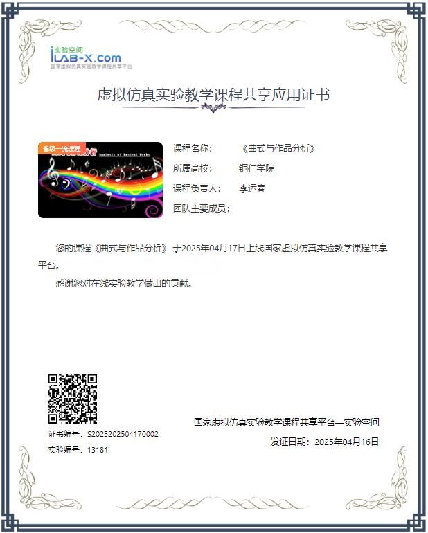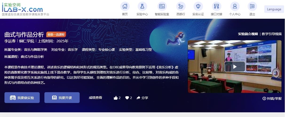 近日,beat365官网艺术学院李运春博士主持建设的省级一流课程《曲式与作品分析》成功入驻“实验空间ilab-x”国家虚拟仿真实验教学课程共享平台,成为贵州省首个登陆该国家级平台的音乐类虚拟仿真课程。