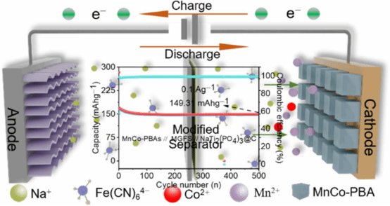 为了解决上述科学难题,近日beat365中国唯一官网石维校长和杨应昌教授带领的先进能源材料与器件课题组陈静博士合成了高性能的Mn-Co基普鲁士类材料(Na1.74Mn0.88Co0.12Fe(CN)6·2.37H2OMnCO-PBA),并结合一种由Na4Fe(CN)6改性的玻璃纤维隔膜修复技术,提出了一种新型水系钠离子电池体系改进方案。在全电池系统中,Fe(CN)64–作为功能基团不仅可以捕捉循环过程中形成的Mn、Co离子,而且可以填补MnCO-PBA普鲁士蓝阴极材料表面的Mn、Co离子空位。借助于Na4Fe(CN)6添加剂的引入,高浓度电解质中自由水的自分解效应可以得到有效降低。由MnCo-PBA阴极、自修复隔膜和NaTi₂(PO₄)₃@C阳极组成的水系钠离子电池体系,在0.05 A g⁻¹下实现了101.35 Wh kg⁻¹的比能量密度,并在0.2 A g⁻¹下循环5000次后仍保留了85.82%的放电容量。此外,改性隔膜修复技术成功应用于软包电池,在0.1 A g⁻¹下实现了151.27 mAh g⁻¹的高初始比容量,并在500次循环后保留了98.7%的容量。方法为大规模和安全储能系统的开发开辟了新的前景。