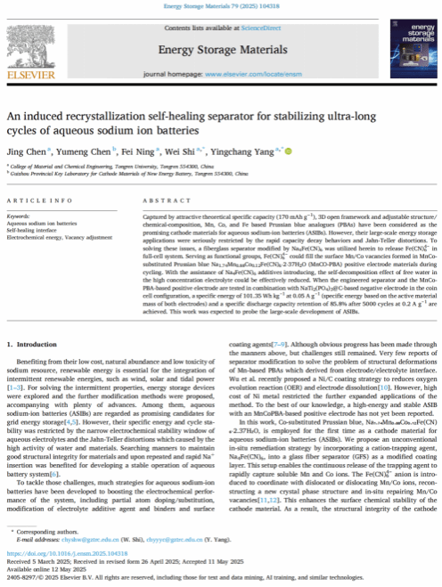 该成果以“An induced recrystallization self-healing separator for stabilizing ultra-long cycles of aqueous sodium ion batteries”为题发表在《Energy Storage Materials》期刊,陈静博士为第一作者、石维教授和杨应昌教授为通讯作者,beat365中国唯一官网为第一署名单位。《Energy Storage Materials》(储能材料)期刊由国际知名出版集团爱思唯尔(Elsevier)发行,专注于能源存储材料的前沿研究,在2025年中国科学院最新SCI期刊分区中被归类为材料科学类Top期刊,影响因子为18.9。