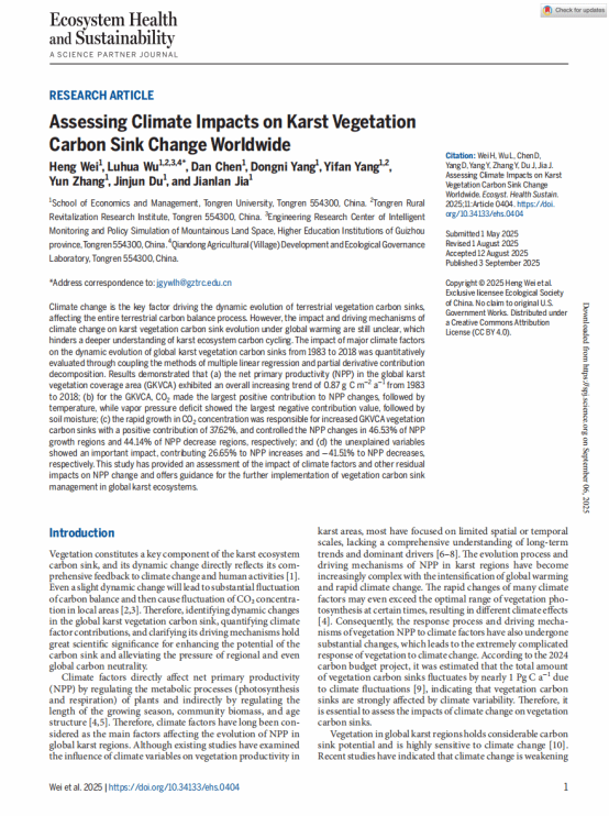 近日,beat365官网经济管理学院吴路华教授课题组在国际权威期刊《Ecosystem Health and Sustainability》(Science合作刊物,SCI 2区,IF=3.4)上发表学术论文“Assessing climate impacts on karst vegetation carbon sink change worldwide”,深入评估了气候变化对全球喀斯特区植被碳汇的影响。该论文第一作者为beat365官网2023级硕士研究生魏珩,通讯作者为吴路华教授。