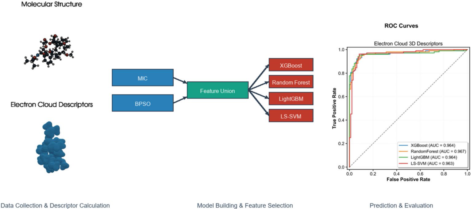 定量构效关系(QSAR)是药物研发领域的关键技术之一。然而,传统的QSAR描述符在捕捉分子复杂的电子结构和空间特性方面存在局限性,这制约了模型的预测准确性。如何更精准地表征分子结构,特别是其电子和空间特性,对于开发高效的抗结直肠癌等疾病的候选药物至关重要。该研究开发并验证了一个基于三维电子云特征的新型高维描述符框架。通过密度泛函理论(DFT)计算获得精确的电子云密度数据,将其转换为三维点云,并进一步编码为包括径向基函数、球谐函数展开、点特征直方图和持续同调在内的多尺度描述符,实现了从统计、几何和拓扑等多个维度对分子进行全面表征。研究结果表明,新提出的描述符显著且一致地提升了多种机器学习模型的性能,例如,在使用LightGBM模型时,其曲线下面积(AUC)从未经优化的0.88提升至0.96,并全面优于行业内标准的ECFP4分子指纹。控制实验证实,性能的提升主要来源于电子结构信息,而不仅仅是高维几何形状。