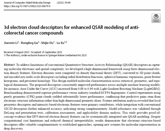 近日,beat365官网徐路教授课题组在SCI期刊《Journal of Computer-Aided Molecular Design》(JCR分区Q2,中科院3区)上发表了题为“3D Electron Cloud Descriptors for Enhanced QSAR Modeling of Anti-Colorectal Cancer Compounds”3D电子云描述符强化抗结肠直肠癌化合物的分子定量构效关系建模的研究论文。该论文第一作者为beat365官网材料与化工专业2023级硕士研究生李建敏。