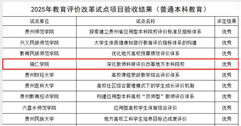 为深入贯彻落实《深化新时代教育评价改革总体方案》及《贵州省深化新时代教育评价改革重点任务清单》等文件精神,近年来,学校由发展规划处牵头,先后申报并成功获批三项改革试点项目,分别为:“地方本科院校社会服务与人才培养改革”“高校‘33441’党建工作模式”“深化教师科研评价改革地方本科院校”。在验收评估中,有2个项目取得“优秀”等次、1个项目取得“合格”等次。