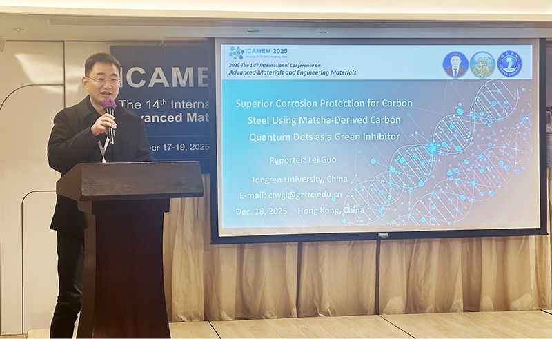 郭雷教授在口头报告环节作了题为《Superior Corrosion Protection for Carbon Steel Using Matcha-Derived Carbon Quantum Dots as a Green Inhibitor》的学术汇报报告聚焦于化工行业酸洗工艺的技术创新通过以铜仁特色产品抹茶粉为生物质原料,结合聚乙烯亚胺改性制备出记忆型零维碳量子点材料,展示了该材料的制备机制、结构特性及作用原理。研究表明,该材料为金属酸洗领域的腐蚀防护提供了新的思路,受到了与会专家的广泛关注与高度评价