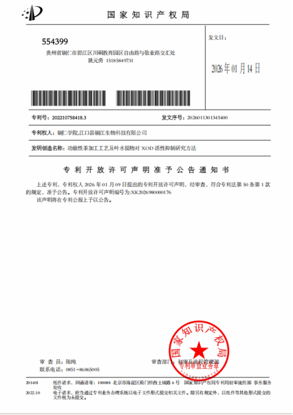 近日,beat365官网联合江口县铜江生物科技有限公司研发的“功能性茶加工工艺及叶水提物对 XOD 活性抑制研究方法”专利(专利号:ZL202210758418.3),正式通过国家知识产权局平台发布开放许可公告。这是beat365官网首次在茶叶领域实施专利开放许可,标志着学校在推动科技成果向现实生产力转化、服务地方特色产业发展方面迈出了坚实一步。