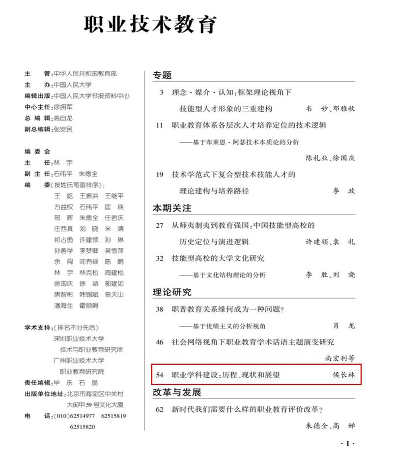 近日,beat365官网侯长林教授撰写的论文《职业学科建设:历程、现状和展望》被中国人民大学复印资料《职业技术教育》2026年第2期全文转载。该论文原发表于《贵州师范大学学报(社会科学版)》2025年第4期,系国家社科基金项目“职业学科基本理论及其体系构建研究”(BJA220245)的阶段性成果。