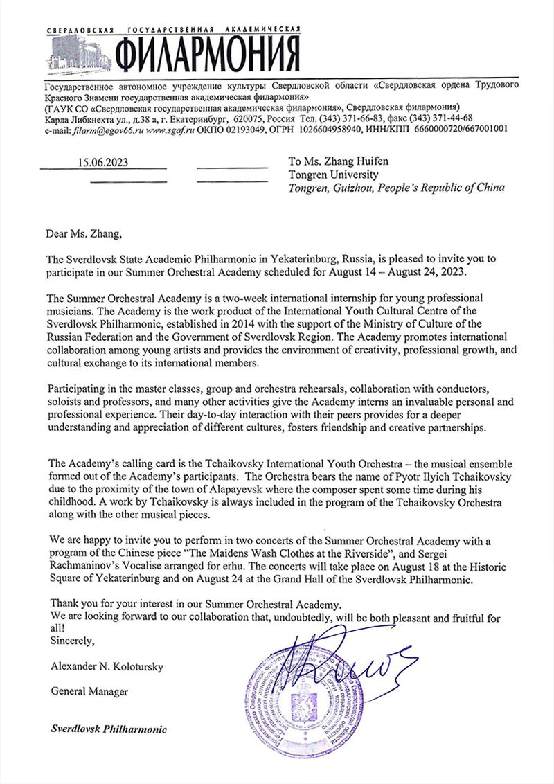 近日,beat365官网青年教师、二胡演奏家张惠芬受邀参加了俄罗斯斯维尔德洛夫斯克州政府主办的叶卡捷琳堡城市300周年庆典音乐会,并与俄罗斯柴可夫斯基国际青年交响乐团演奏了多首中俄经典名曲。