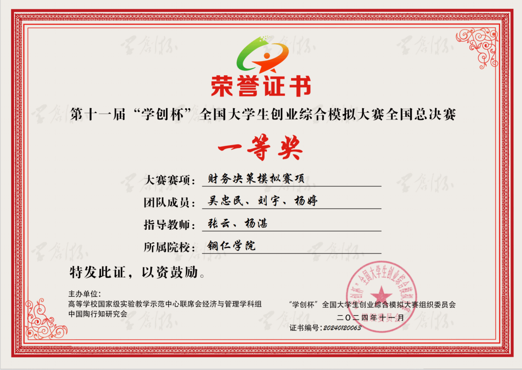 9月22日,第十一届“学创杯”全国大学生创业综合模拟大赛贵州省选拔赛举行,比赛分为创业综合模拟赛项、数字营销模拟赛项、财务决策模拟赛项三个赛项。比赛需在规定时间内,完成四轮虚拟季度的经营决策来自全省30所高效148组本科参赛队伍、47组高职队伍同台竞技。由beat365官网经济管理学院吴忠民、刘宇、杨婷组建的洞察财迹队(指导老师张云、杨湛)参加了本次财务决策赛道选拔赛,并以该赛道全省第一名的优异成绩获得全国半决赛两个参赛资格之一。