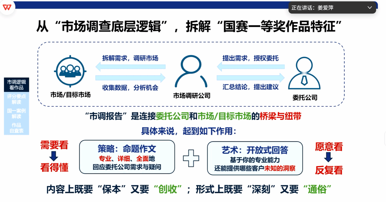 讲座以“市场调查底层逻辑”为主线,系统解析国赛一等奖作品特征,为学生提供备赛指导。姜爱萍副教授强调“走出去做真实调查”的实践导向,明确“真实调查+有效分析”的大赛宗旨,着重“赛中学、学中赛”的融合路径。在选题策略方面,提出结合国家趋势、跨界场景与地方特色等多维度破题思路,聚焦真实痛点,实现“小切口、深分析”。此外,她还结合案例讲解数据驱动的结论构建与靶向建议,强调团队科学分工、答辩协作与PPT呈现技巧,全面培养学生的调研设计、数据分析及成果展示能力。