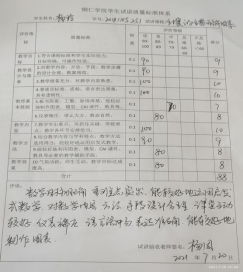 此次活动,我班全体学生顺利通过试讲验收,其中杨玲、刘小兰、白玉梅等同学表现优异,获得老师的积极评价与高度认可,为更好地提升学生的教学技能起到助推作用,也为下学期教育实习的顺利开展奠定了良好的基础。