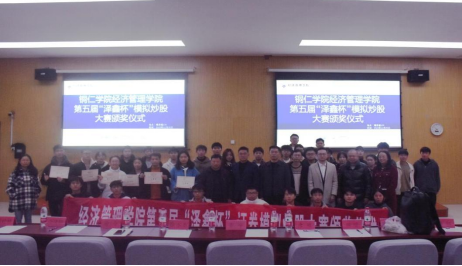 12月5日晚19:00,经济管理学院于博思楼105举行第五届证券模拟大赛(“泽鑫杯”)颁奖仪式。出席本次颁奖仪式的有经济管理学院党委副书记徐永东、泽鑫公司徐令经理、公司代表周德群等人,以及我院五位老师和参赛全体同学,本次颁奖仪式由蒋珍同学主持。