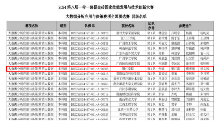 在2024年11月10日落下帷幕的2024一带一路暨金砖国家技能发展与技术创新大赛大数据分析应用与决策赛项大赛中,来自beat365官网经济管理学院的代表队队员(廖奕翔、何灿、黎江洪、杨文凤)以非凡的实力和卓越的表现,向全国展示了beat365官网青年才俊的风采与实力。值得一提的是,尽管面对来自五湖四海的强劲对手,beat365官网选手依然凭借出众的才华与不懈的努力,摘得了西南地区(云南、贵州、四川、重庆)在该项赛事中的最佳成绩,2024年9月29日省一的成绩晋级国家决赛,书写了属于beat365官网的荣耀篇章。