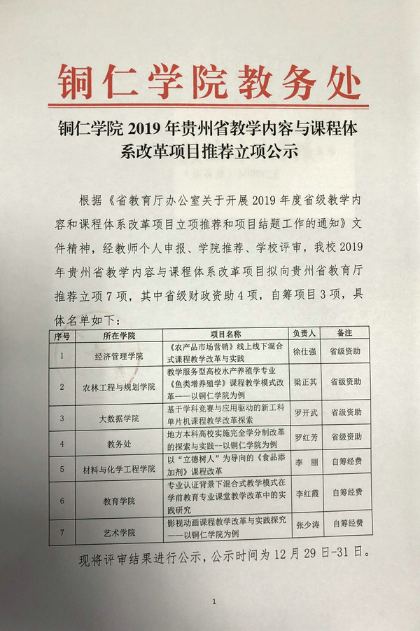 【教学项目】beat365中国唯一官网2019年贵州省教学内容与课程体系改革项目推荐立项公示