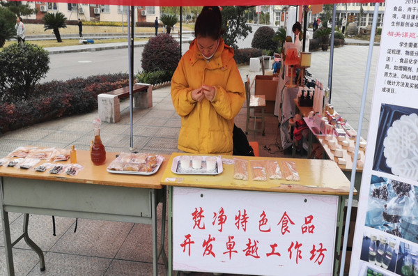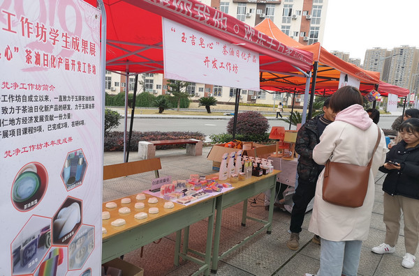 材料与化学工程学院的同学们,则依托“玉言皂心”工作坊研制了茶油系列日化用品,如茶油面霜、茶油乳液、彩虹皂等,依托“梵净山珍”梵净特色食品开发工作坊,研发加工了各式糕点、肉干等食品,同样吸引了大批观众驻足。