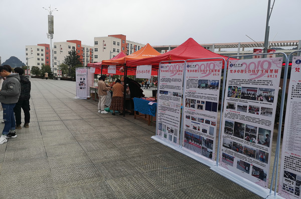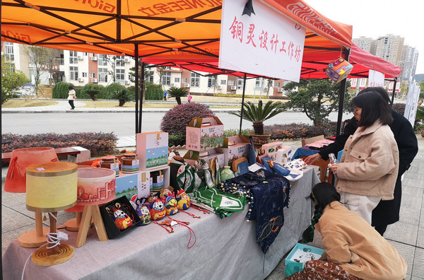 在苗绣工坊、铜灵设计工坊展区,美术学、视觉传达与设计等专业的同学现场展示了他们设计并创作的精美刺绣、木玩作品及其他文创作品,吸引了大量的观众,并现场收获了一大批加工订单。同时,该工作坊还展示了他们参加社区服务所开展的系列活动。