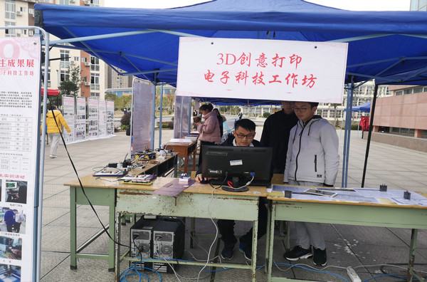 在3D创意打印电子科技工作坊展区,大数据学院信息工程、应用物理学等专业学生向前来观摩的全校师生展示了他们设计制作的超声波雷达演示装置、智能蓝牙遥控汽车、电子云时钟、指纹锁等智能电子产品,迎来了同学们的一片赞誉。