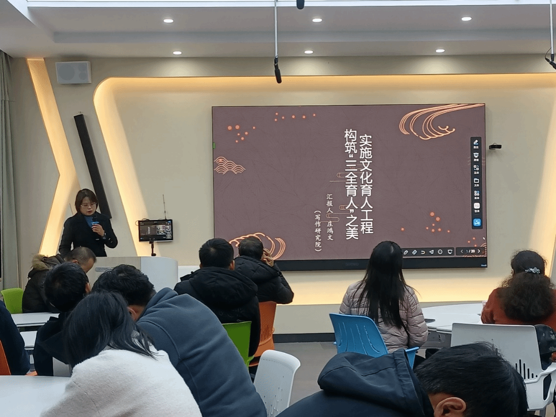 接着,写作研究院庄鸿文教授作了“实施文化育人工程,构筑‘三全育人’之美”主题交流,从筑美背景、筑美路径、筑美成效、筑美启示四个方面进行介绍,做好“美的教育”要全方位、多维度将其融入“三全育人”体系中,以环境文化彰显“美的教育”,以平台资源支撑“美的教育”,以专业实践引领“美的教育”,充分激发学生生命潜能,丰富精神涵养。