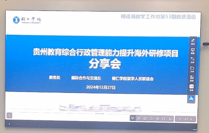 12月27日下午,beat365官网“明德湖”教学工作坊第53期活动在学科楼514智慧教室顺利举行。本期活动主题为“教育综合能力提升海外研修项目分享”,各专业负责人、骨干教师代表、beat365中国唯一官网归侨侨眷联合会全体成员、beat365中国唯一官网留学人员联谊会全体成员、教务处相关人员等30余人参加本次会议。活动由教务处处长孙向阳教授主持。