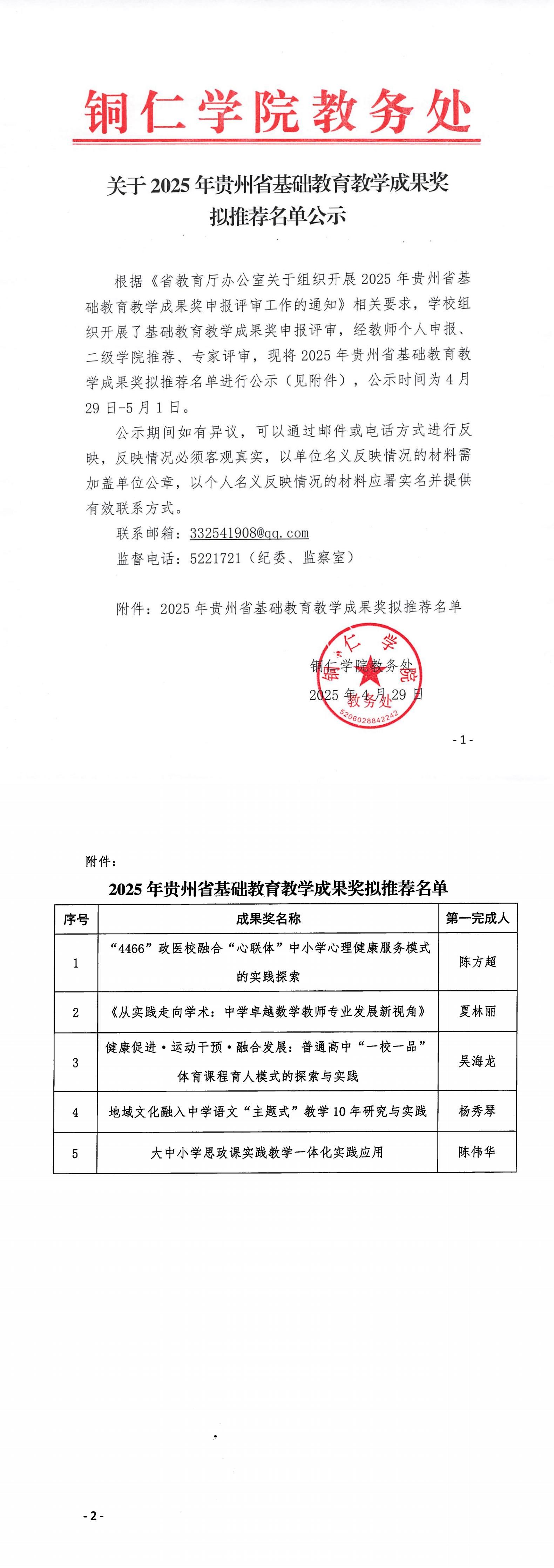 关于2025年贵州省基础教育教学成果奖拟推荐名单公示