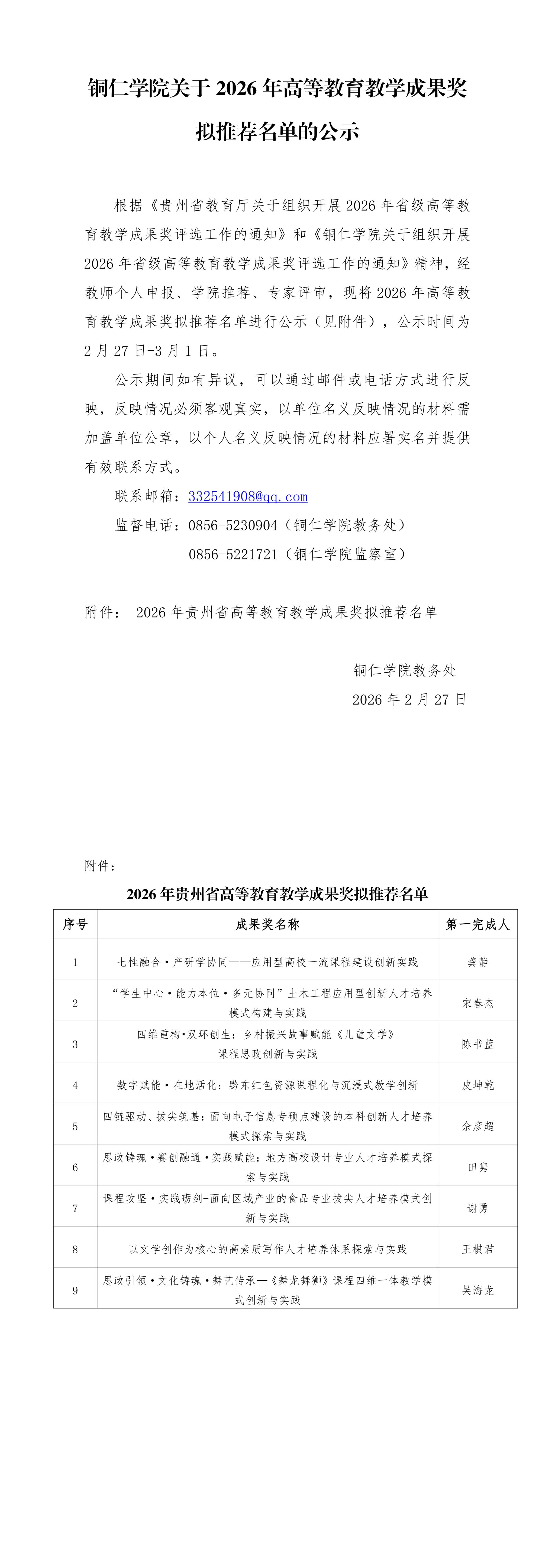 beat365中国唯一官网关于2026年高等教育教学成果奖拟推荐名单的公示