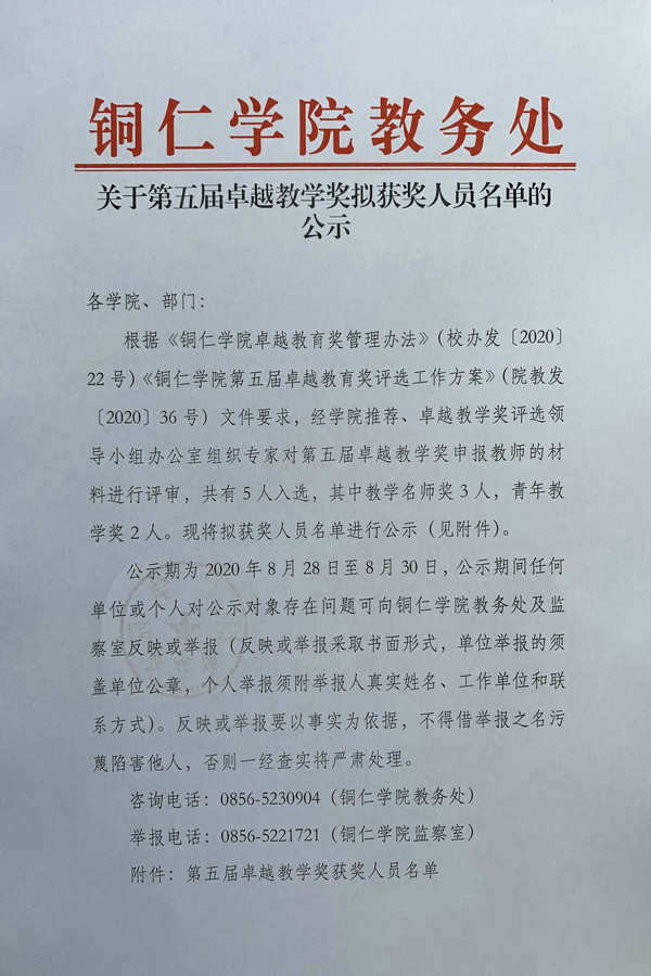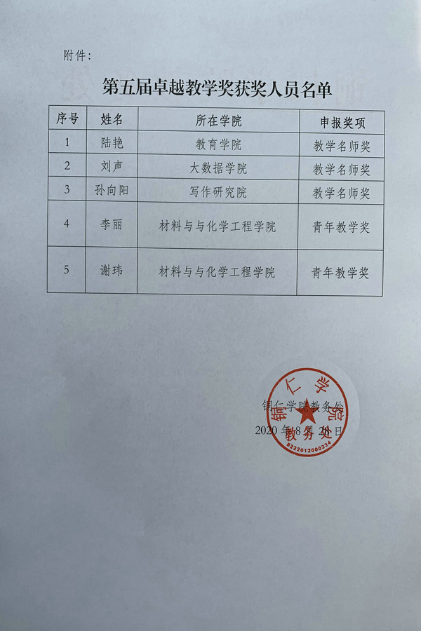 关于第五届卓越教学奖拟获奖人员名单的公示