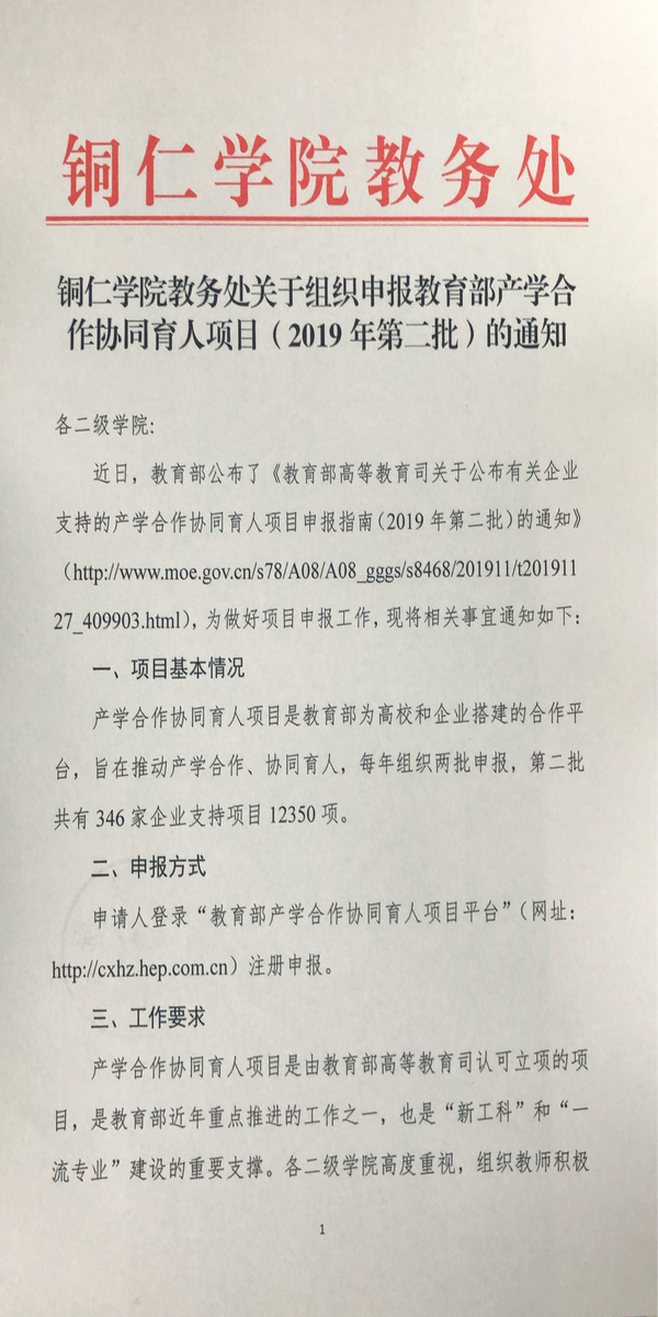 beat365中国唯一官网教务处关于组织申报教育部产学合作协同育人项目(2019年第二批)的通知