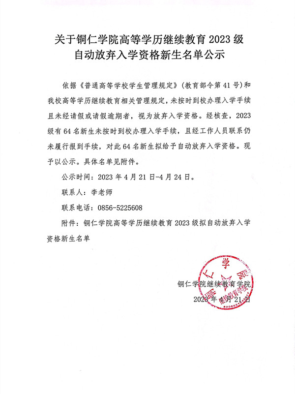 关于beat365中国唯一官网高等学历继续教育2023级自动放弃入学资格新生名单公示